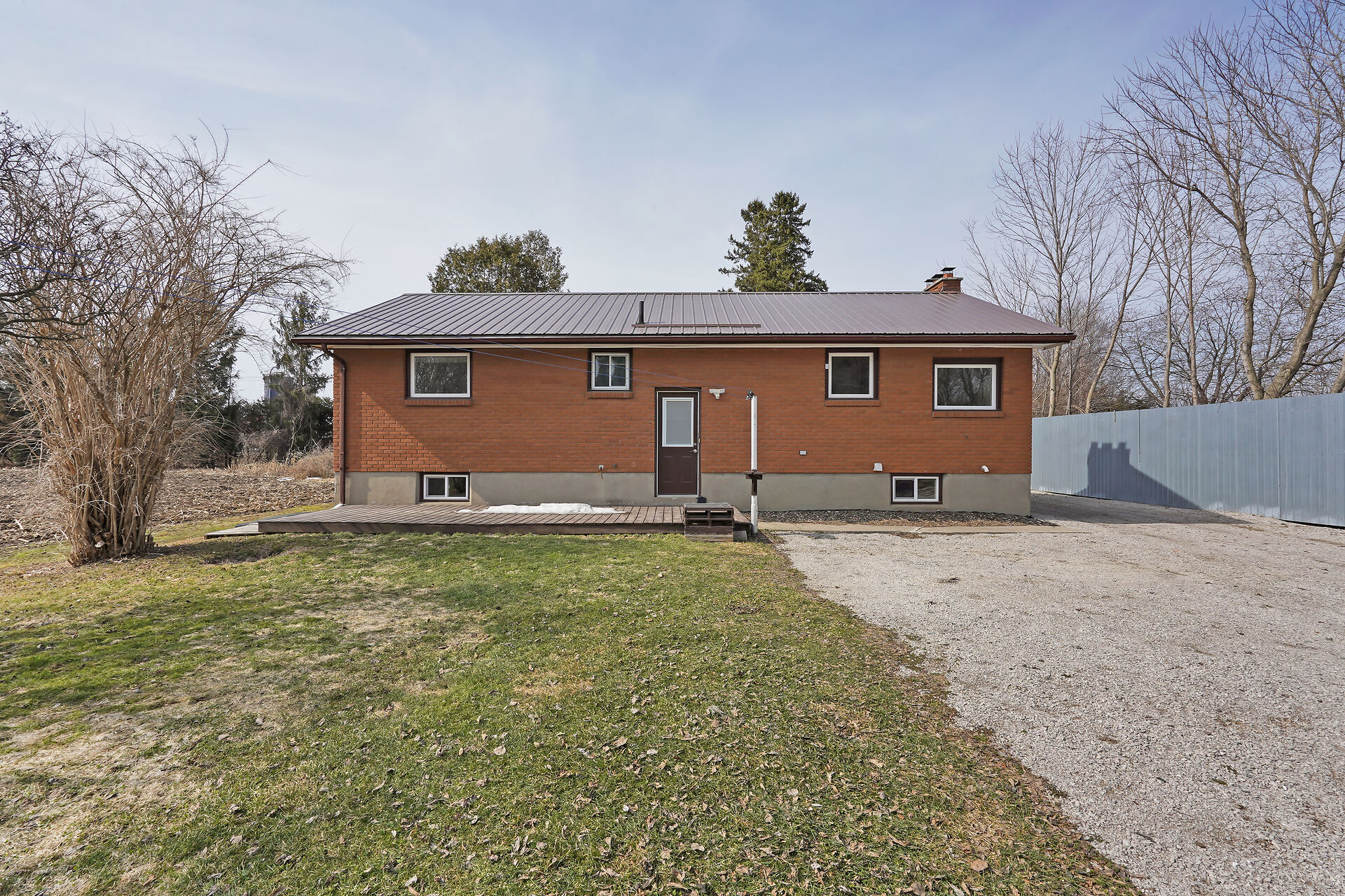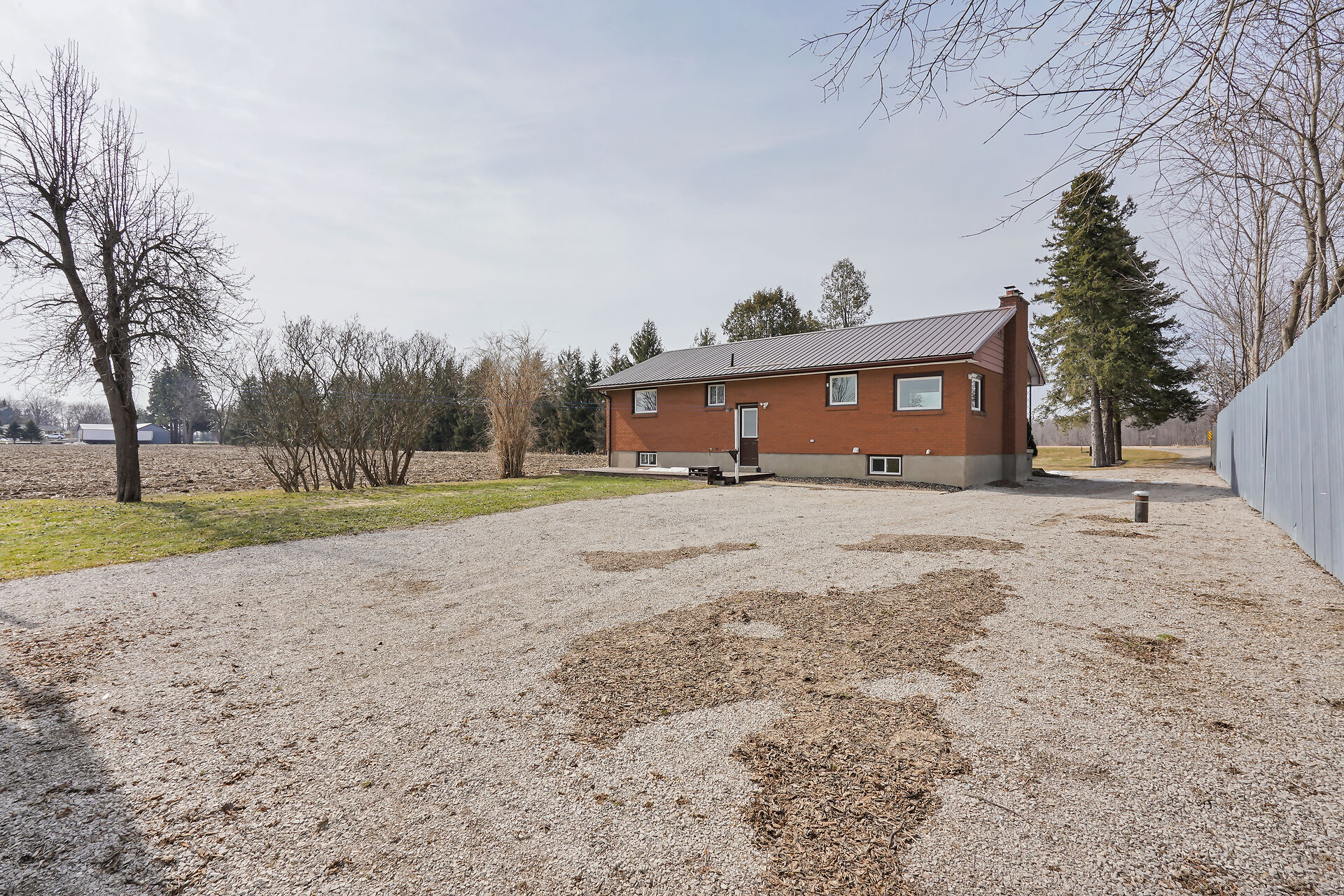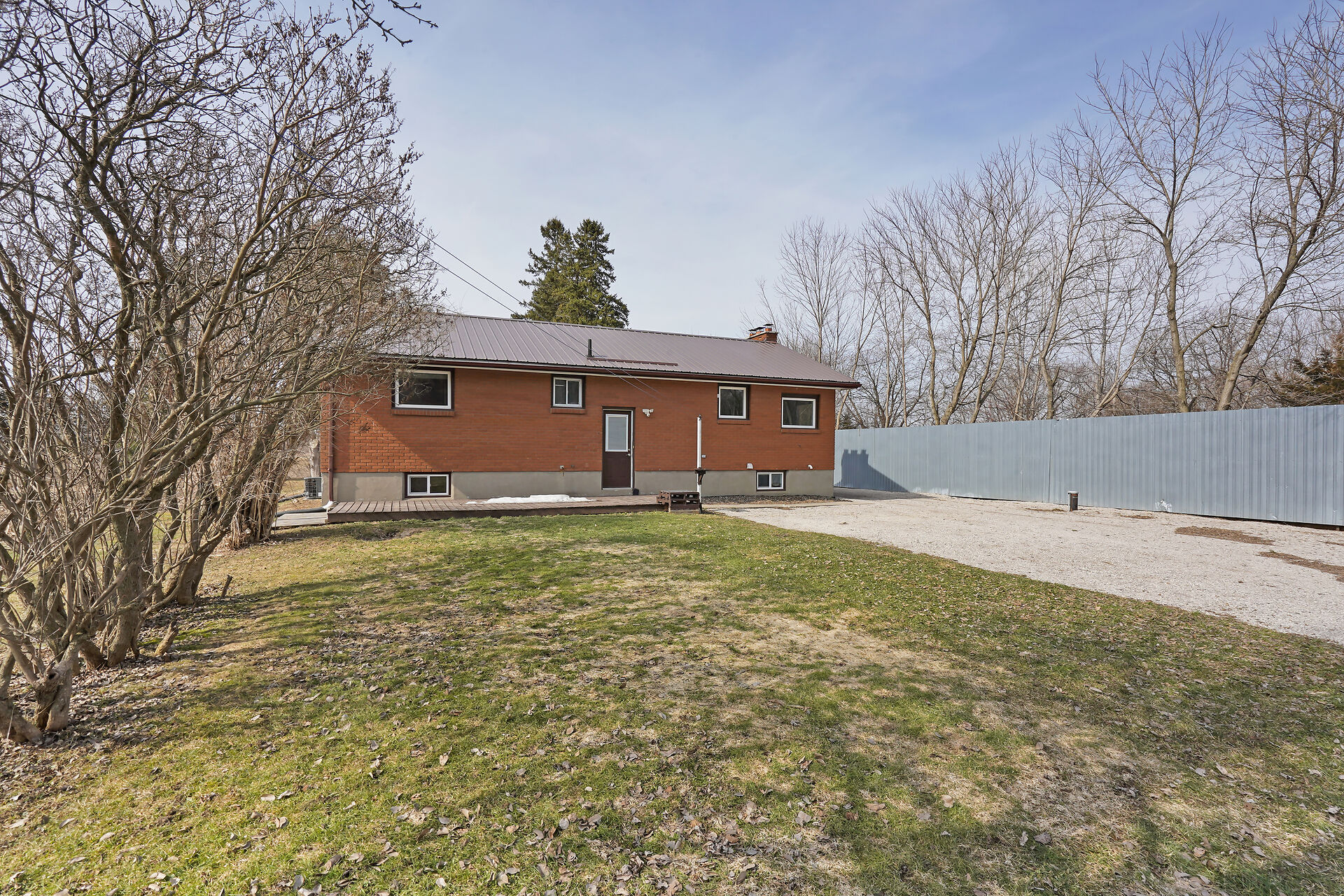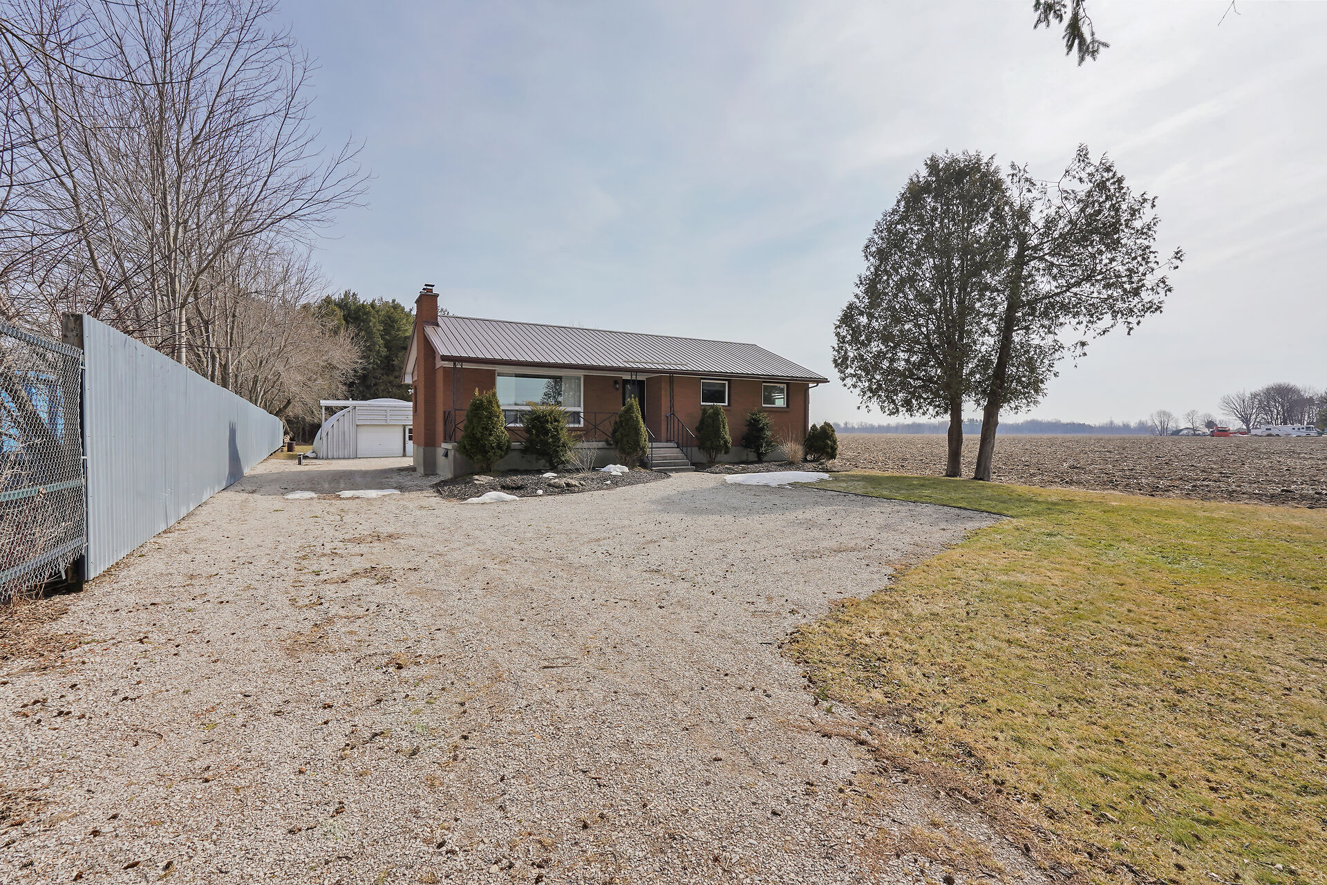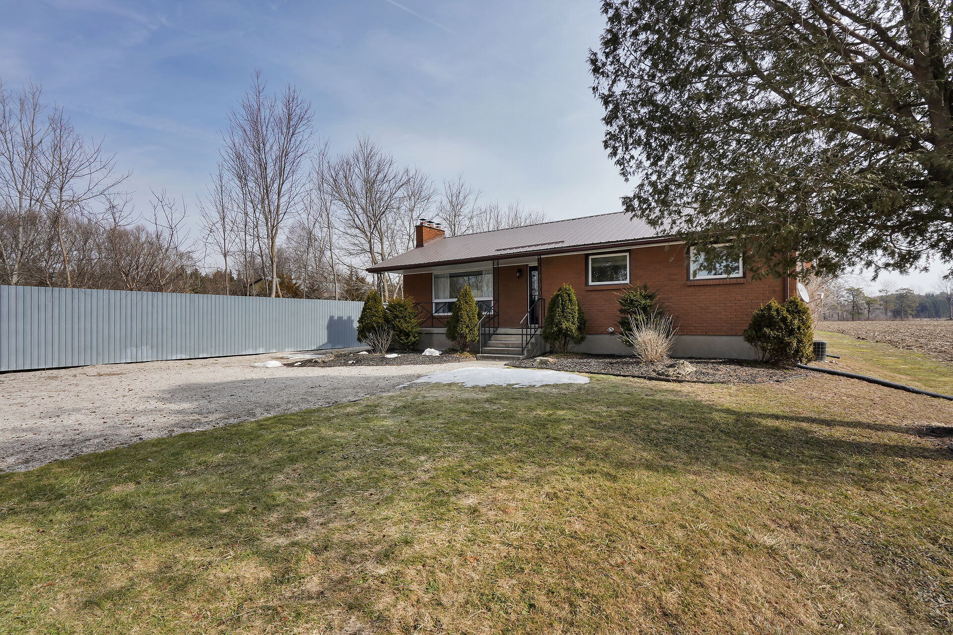 A great little country, cozy brick, home with big garage/shop on not too big of lot, private and short drive to City/Shopping - Updated! The garage is about 25 x 40 ft estimate with concrete floor, hydro and single garage door, rough in for wood stove- plus might fit two cars in tandem! The home has the covered front porch; updated flooring in living room with brick fireplace (as-is); open to dining area then updated kitchen with cabinets & appliances & off the kitchen is convenient door to rear yard. There are 3 carpeted bedrooms on the main. Full updated bathroom with glass doors. The lower level has family room with ba