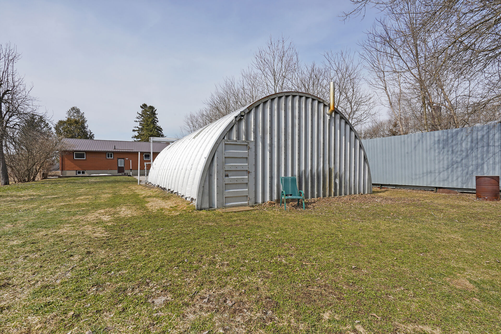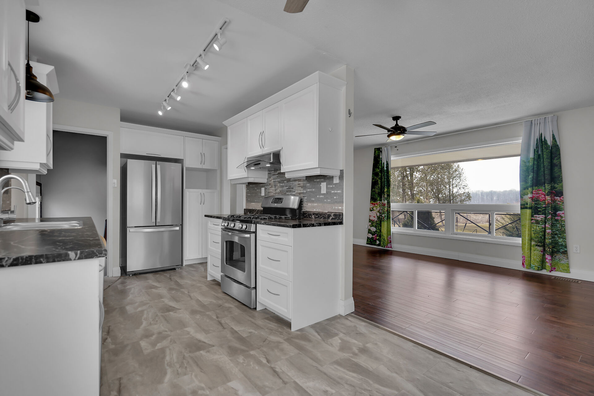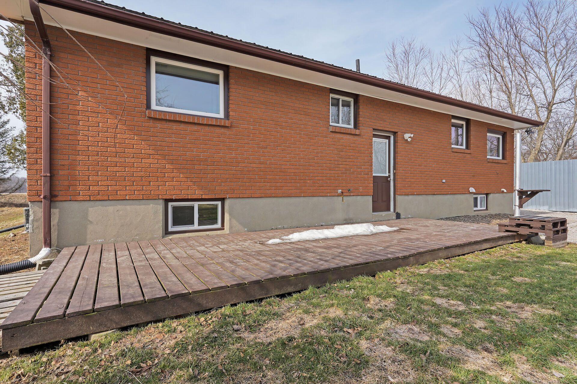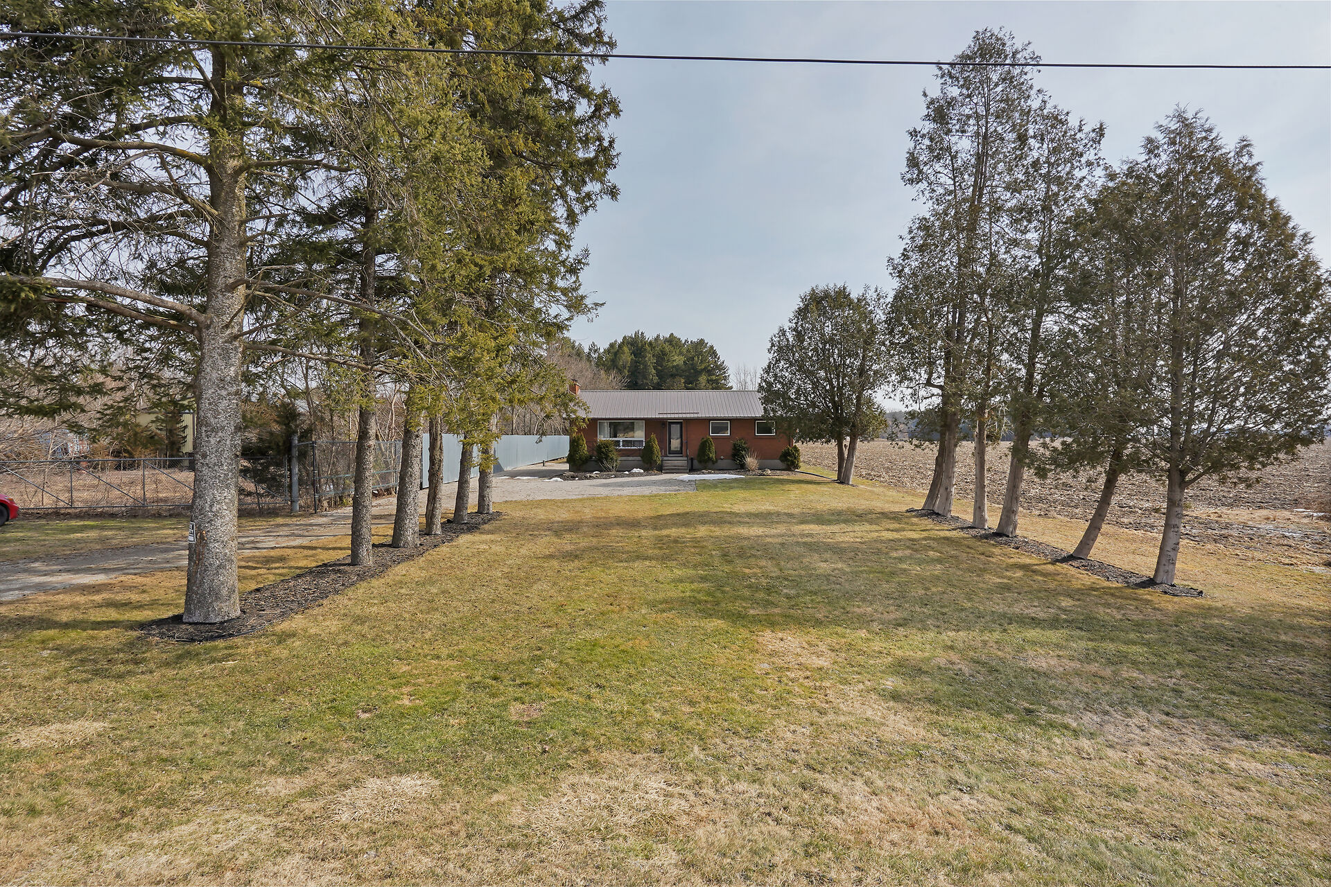 A great little country, cozy brick, home with big garage/shop on not too big of lot, private and short drive to City/Shopping - Updated! The garage is about 25 x 40 ft estimate with concrete floor, hydro and single garage door, rough in for wood stove- plus might fit two cars in tandem! The home has the covered front porch; updated flooring in living room with brick fireplace (as-is); open to dining area then updated kitchen with cabinets & appliances & off the kitchen is convenient door to rear yard. There are 3 carpeted bedrooms on the main. Full updated bathroom with glass doors. The lower level has family room with ba