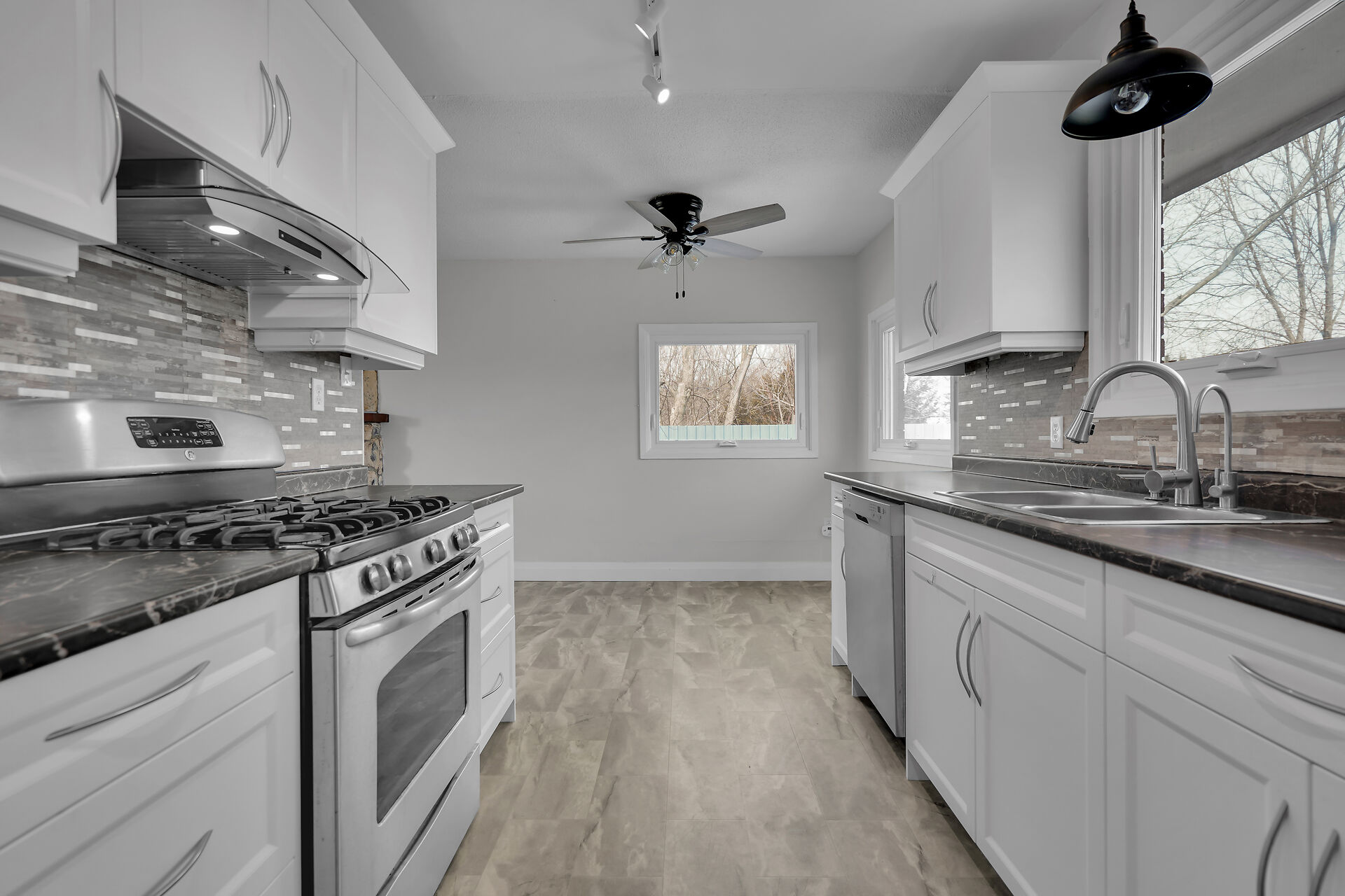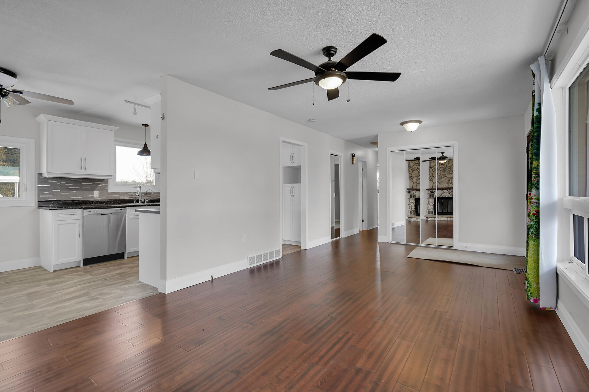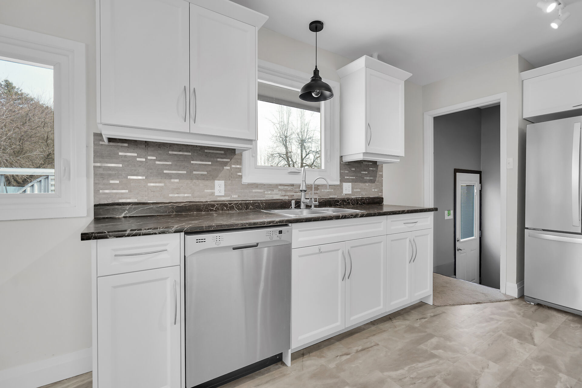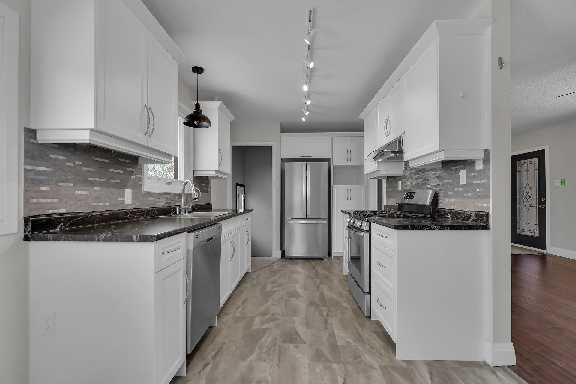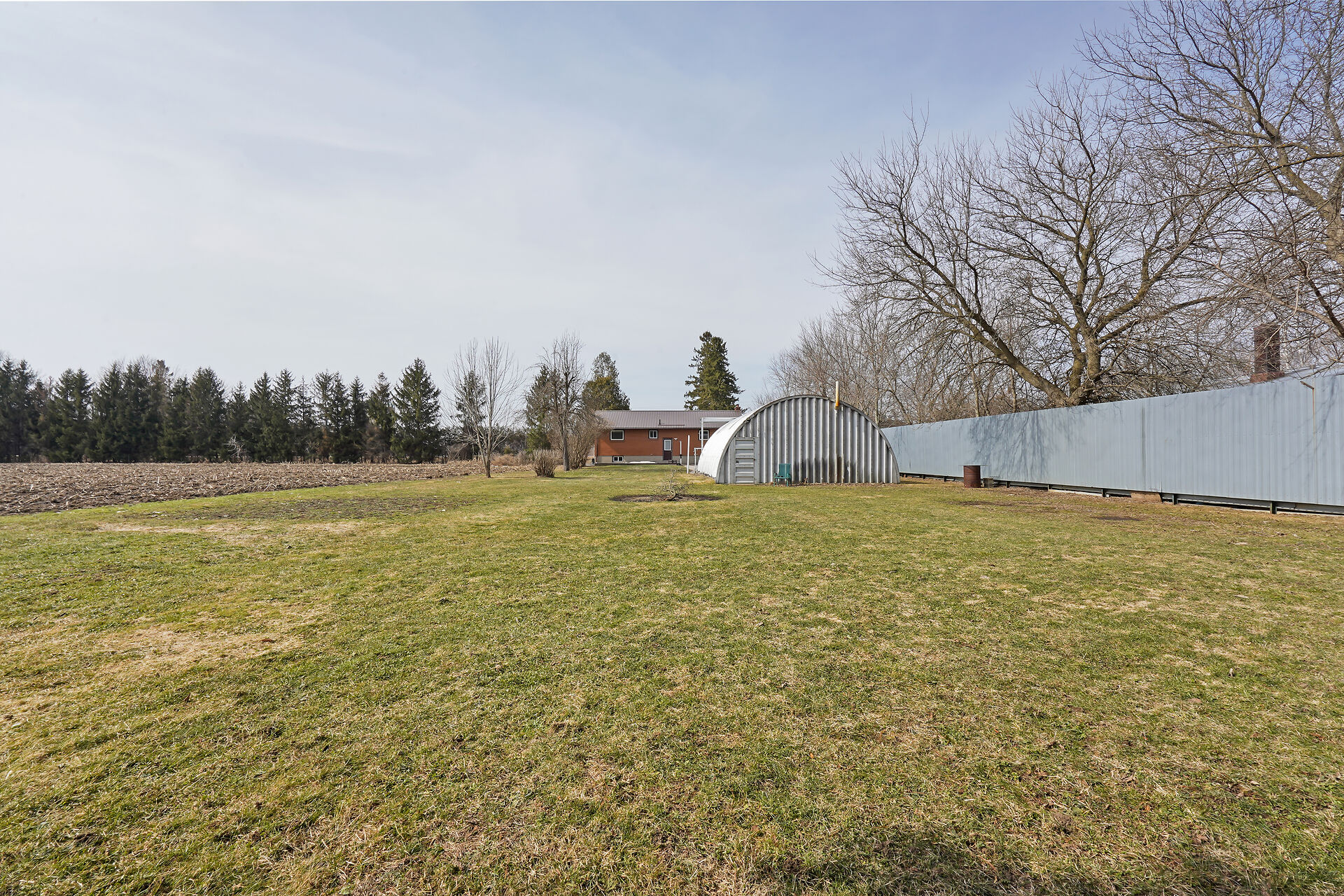 A great little country, cozy brick, home with big garage/shop on not too big of lot, private and short drive to City/Shopping - Updated! The garage is about 25 x 40 ft estimate with concrete floor, hydro and single garage door, rough in for wood stove- plus might fit two cars in tandem! The home has the covered front porch; updated flooring in living room with brick fireplace (as-is); open to dining area then updated kitchen with cabinets & appliances & off the kitchen is convenient door to rear yard. There are 3 carpeted bedrooms on the main. Full updated bathroom with glass doors. The lower level has family room with ba