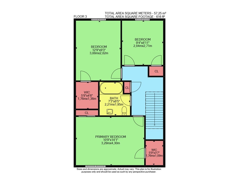 Floor 2: 624 sq ft, Floor 3: 616 sq ft,