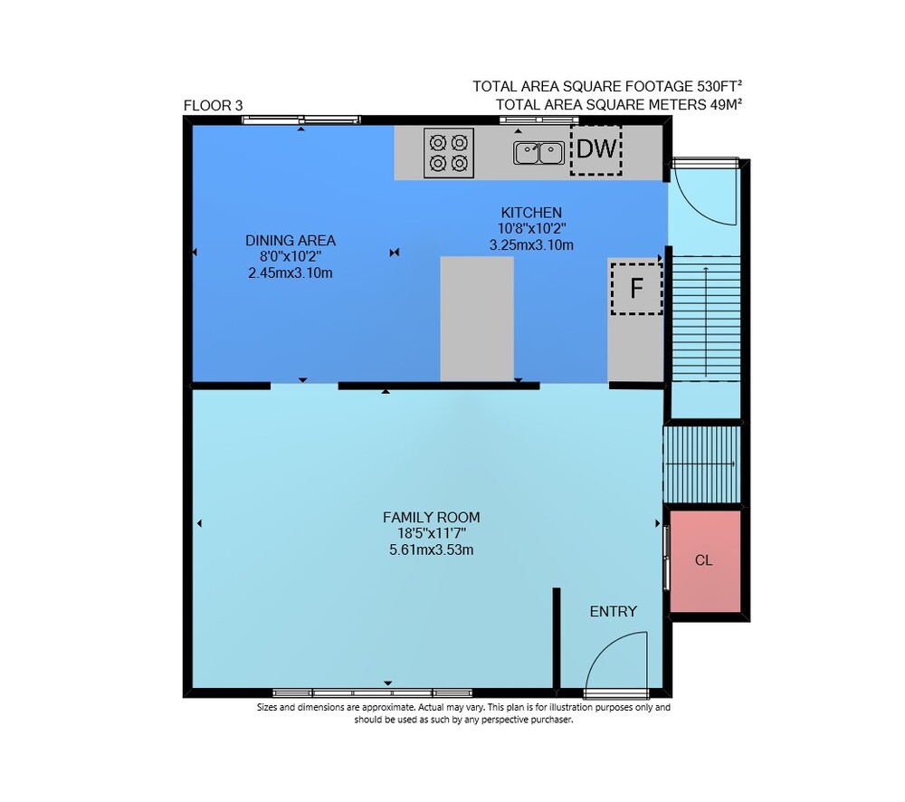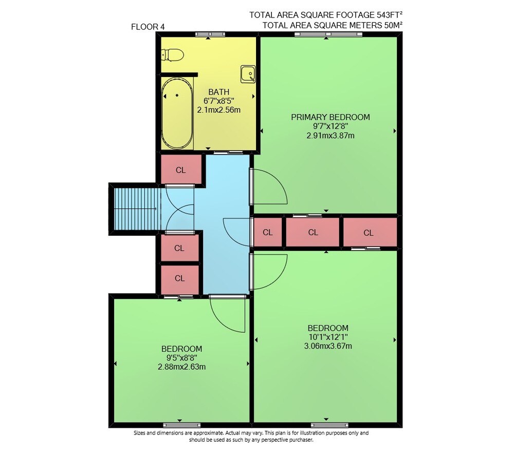 Floor 3: 530 sq ft, Floor 4: 543 sq ft,