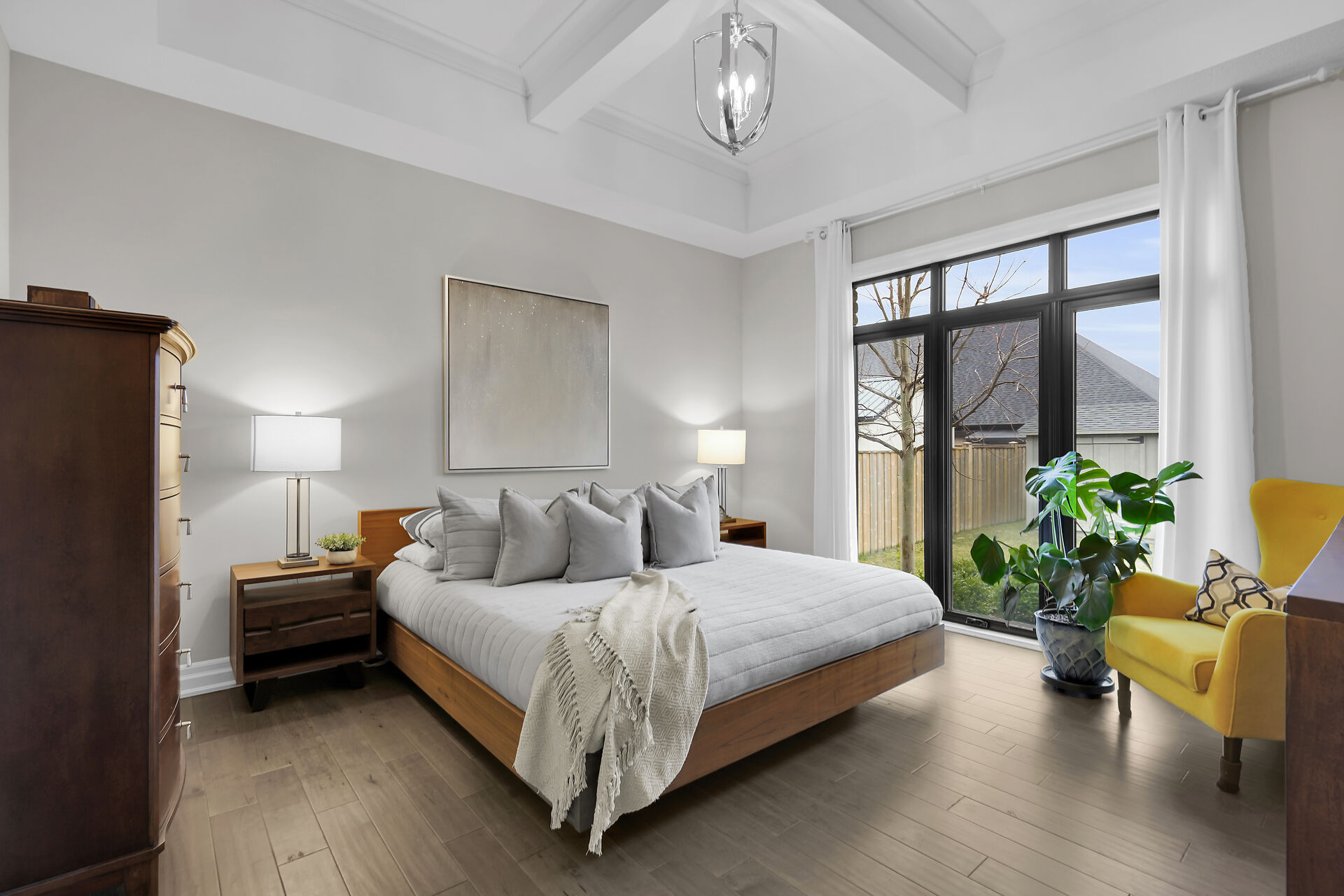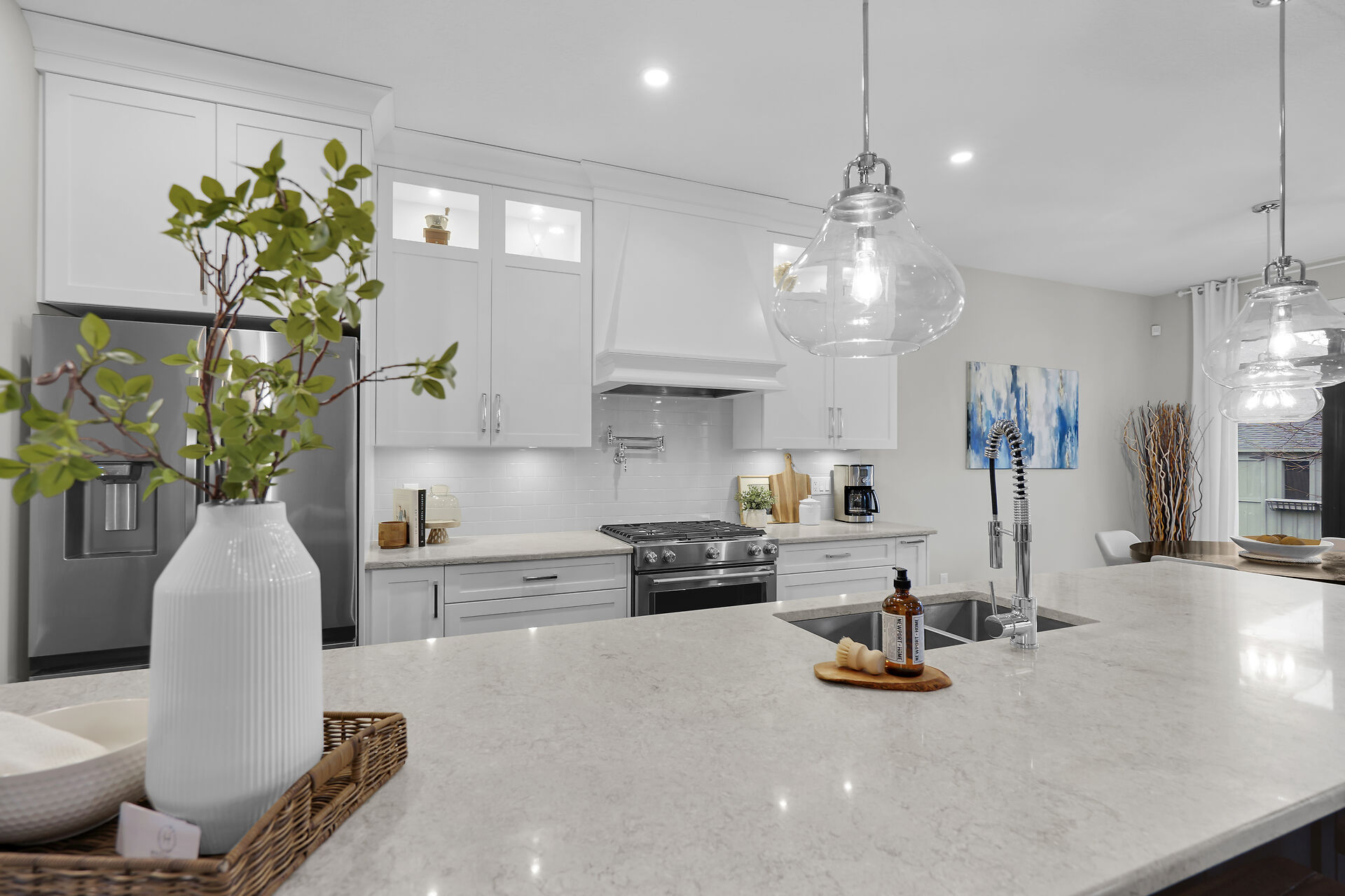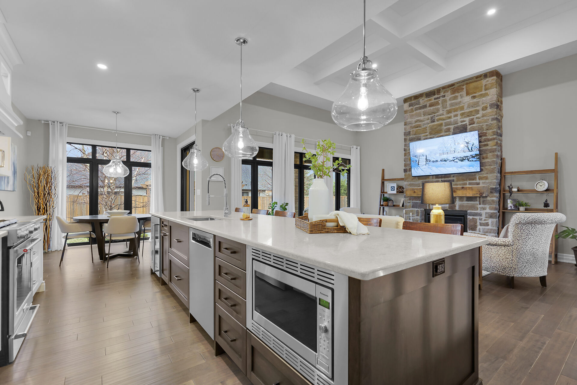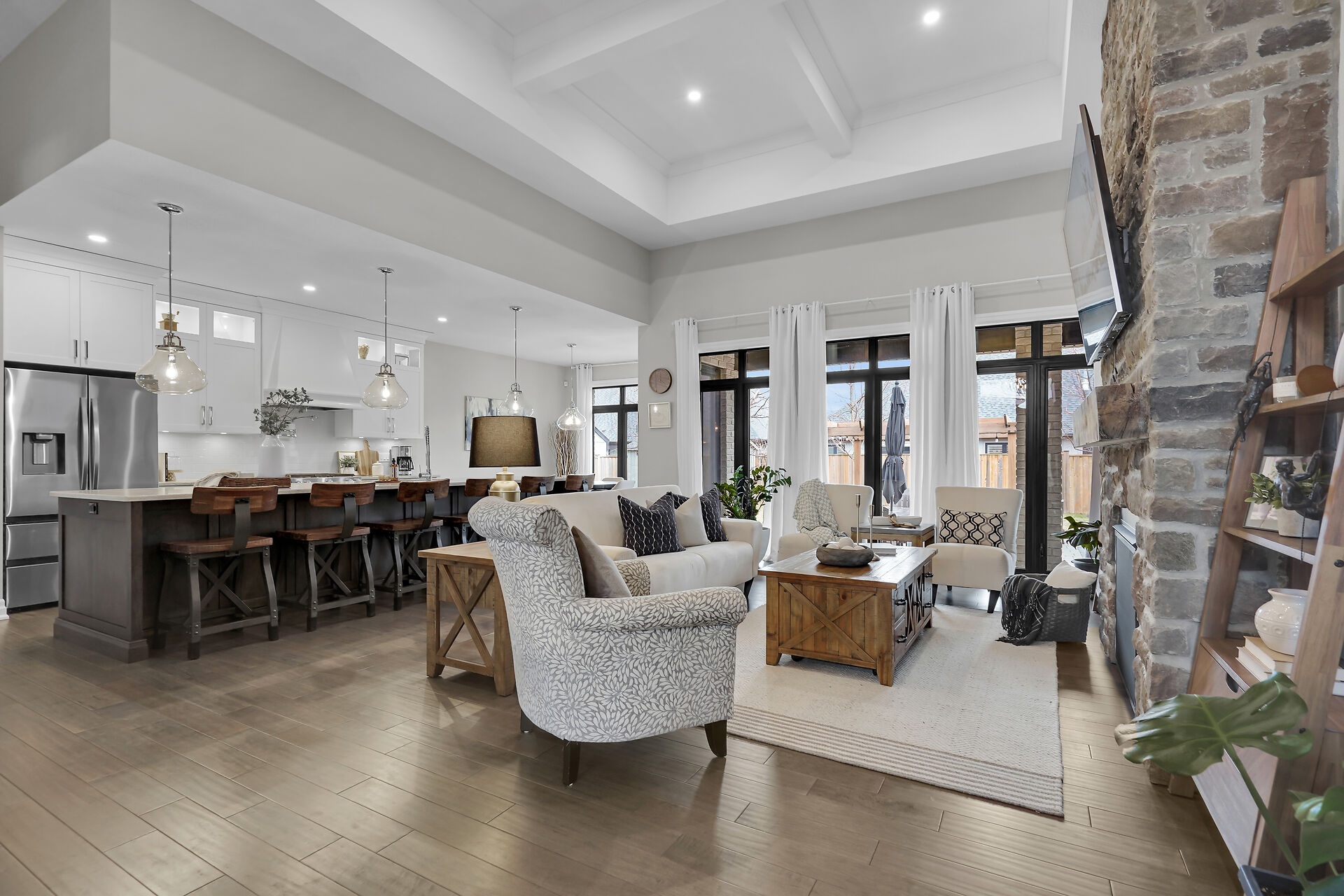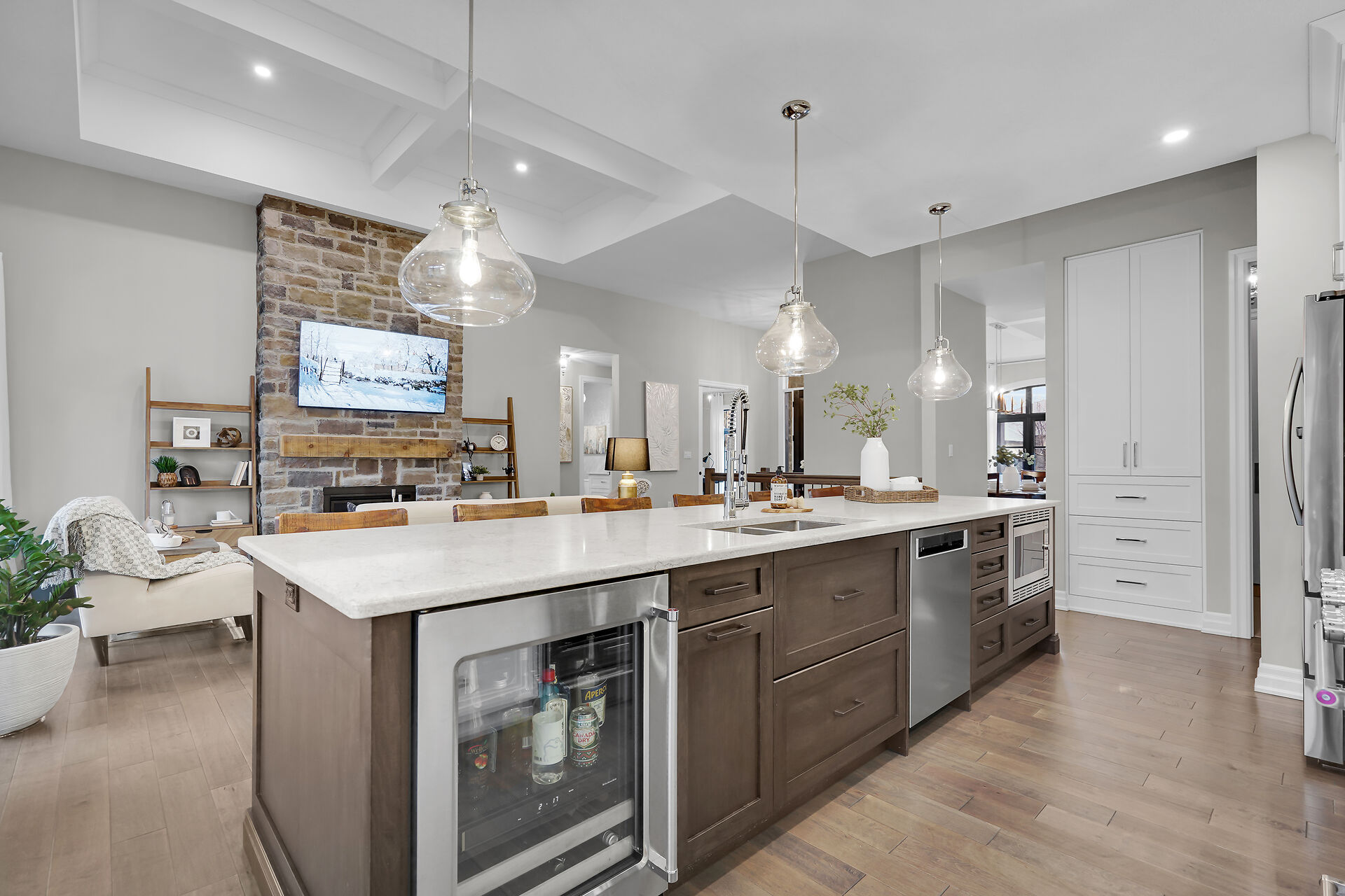 Welcome to this stunning bungalow located in the prestigious and private community of Bella Lago. This meticulously designed 3-bedroom, 4-bathroom Werrington home is in pristine, like-new condition and features numerous high-end upgrades throughout. As you step inside, you are immediately greeted by soaring 14-foot coffered ceilings and oversized, floor-to-ceiling windows that allow for plenty of natural light to flood the space. The home's tasteful décor and attention to detail are evident in every room, making it a true showstopper. The heart of the home is the gorgeous kitchen, which boasts an oversized island, perfect for both cooking and entertaining. The designer kitchen seamlessly flows into the great room.