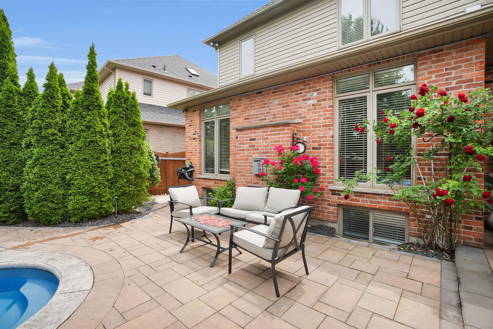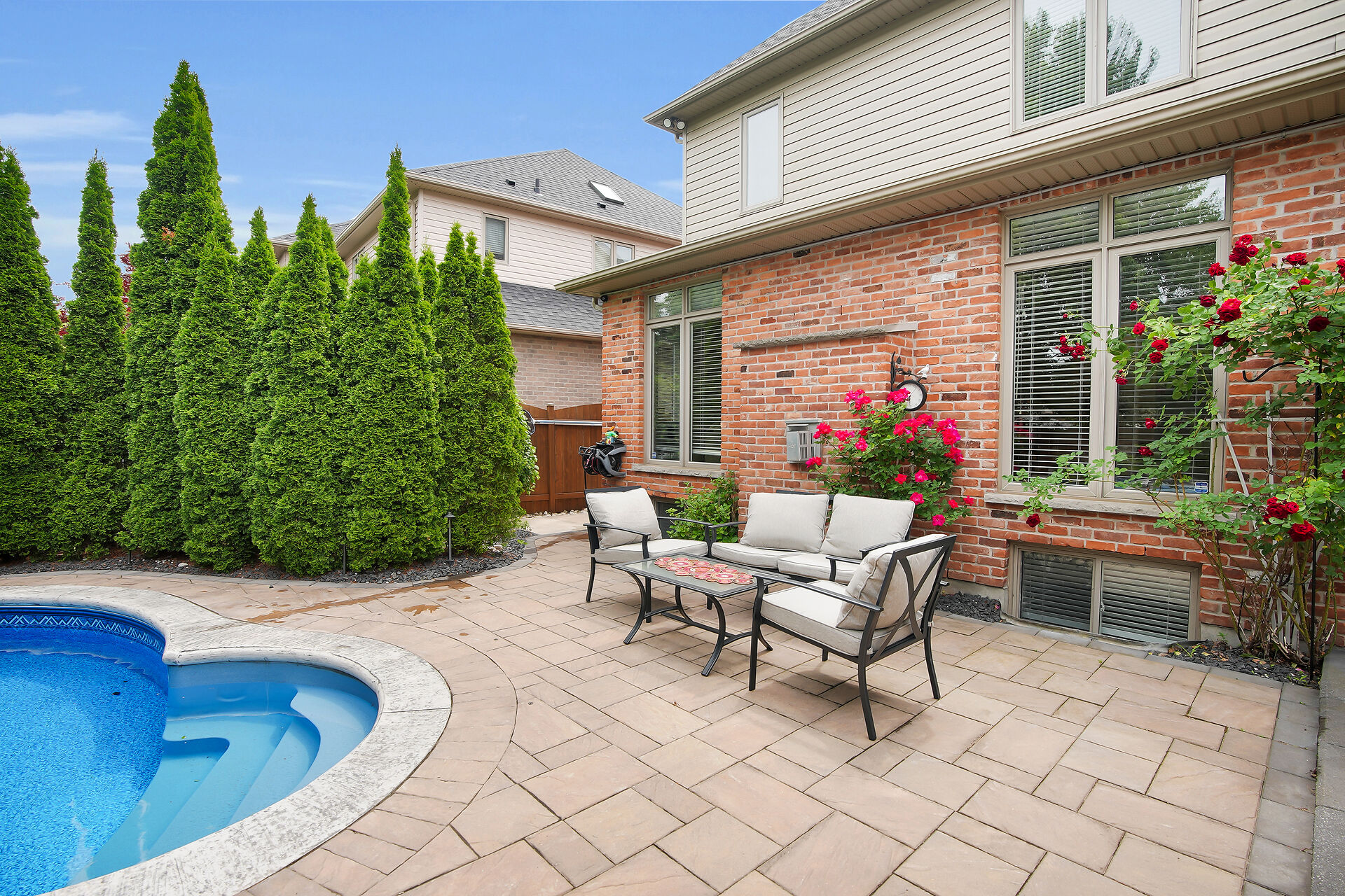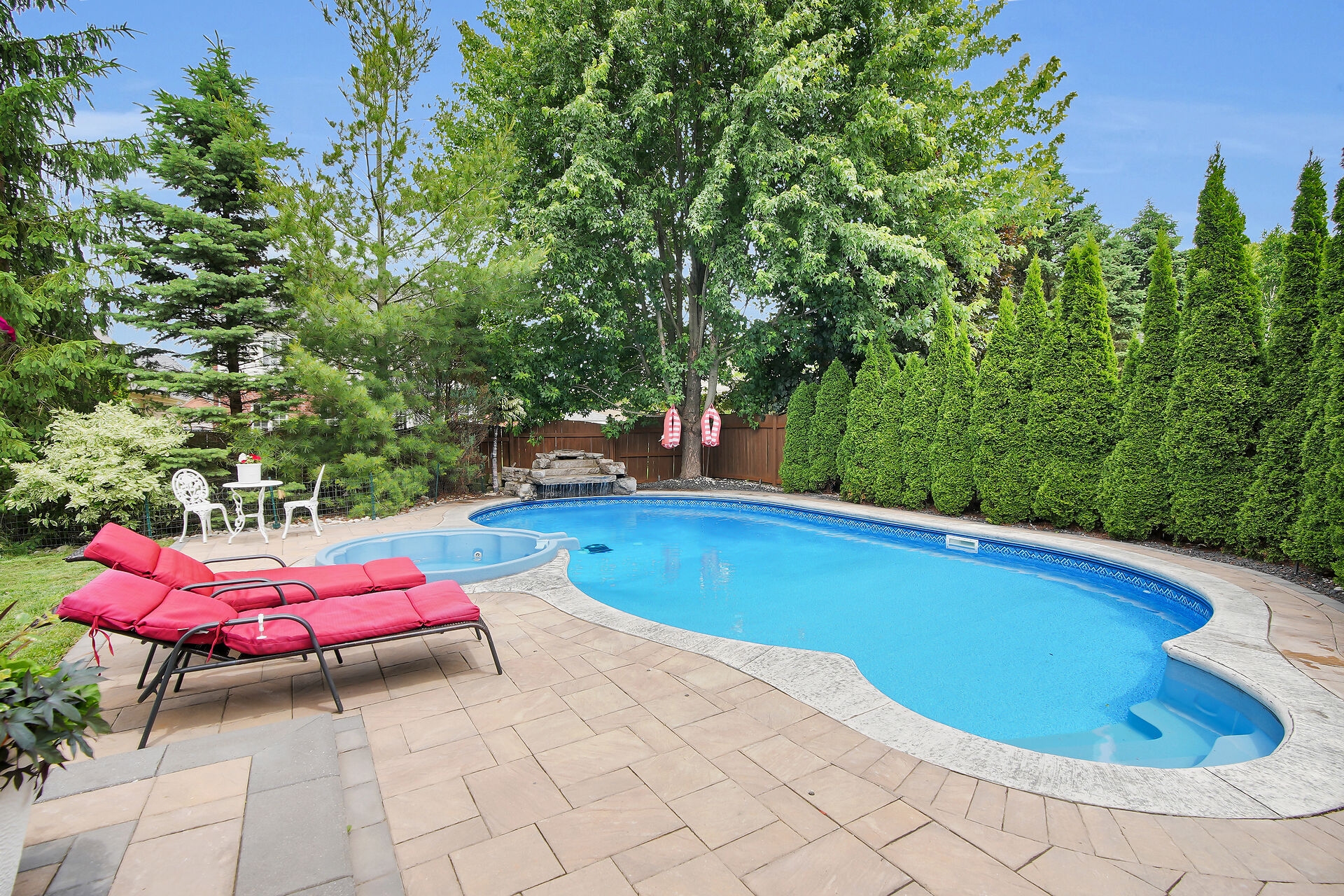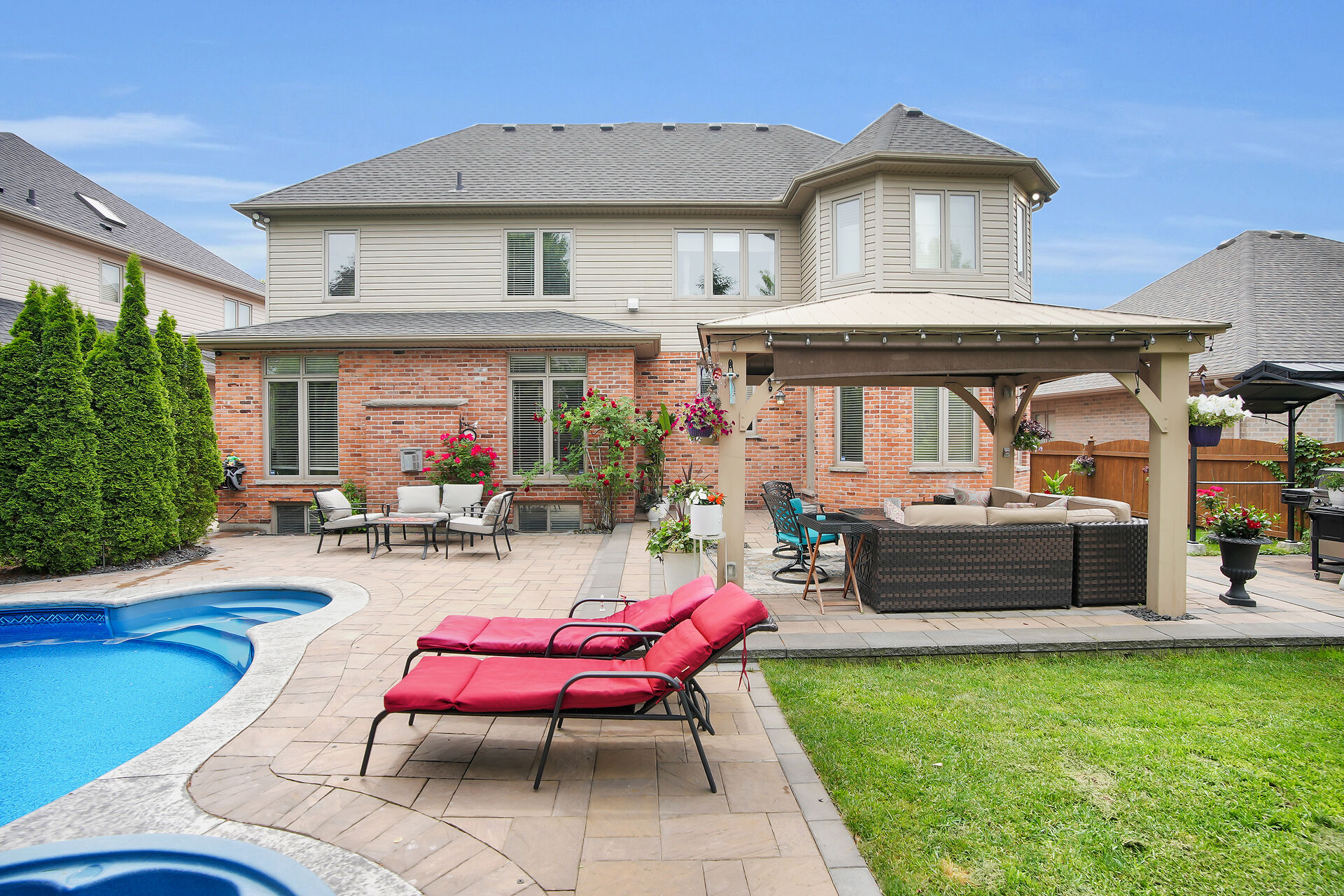 Welcome to this Wasko home in a much sought-after North London neighbourhood. This move-in-ready home offers great curb appeal, spacious principal rooms, vaulted ceilings, and large windows for natural light. The family room features a gas fireplace and built-in speakers throughout the home. The kitchen includes built-in appliances. The finished lower level offers a large rec room, two bedrooms, and a full bath. Outside is a private backyard oasis with an in-ground pool, jetted spa, waterfall, pool house with full amenities, and mature trees. Recent updates include a new pool pump and robot vacuum (2025). Enjoy paver stone patio, a gazebo, BBQ hut, and a hard-wired security system. Call realtor for a full list.