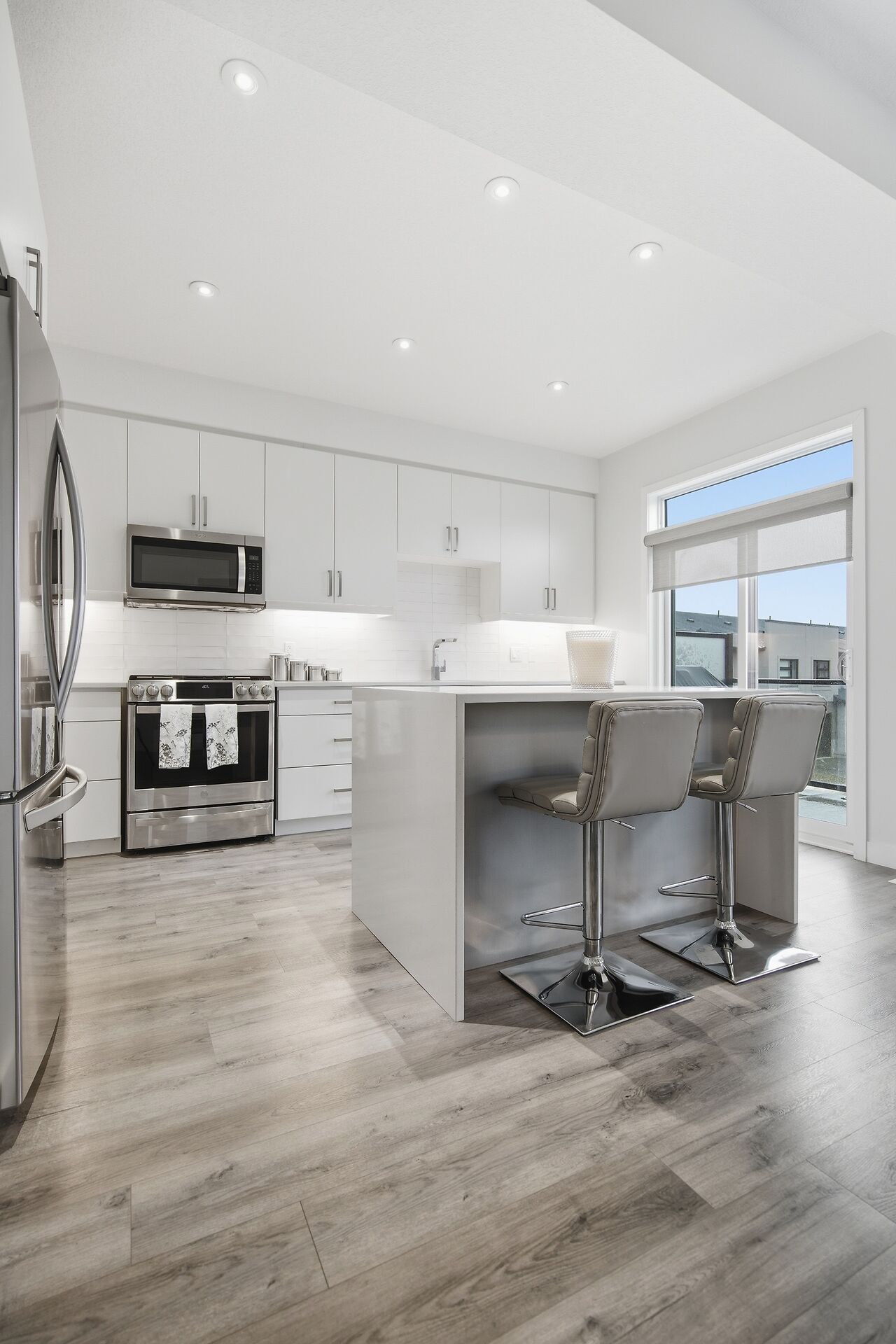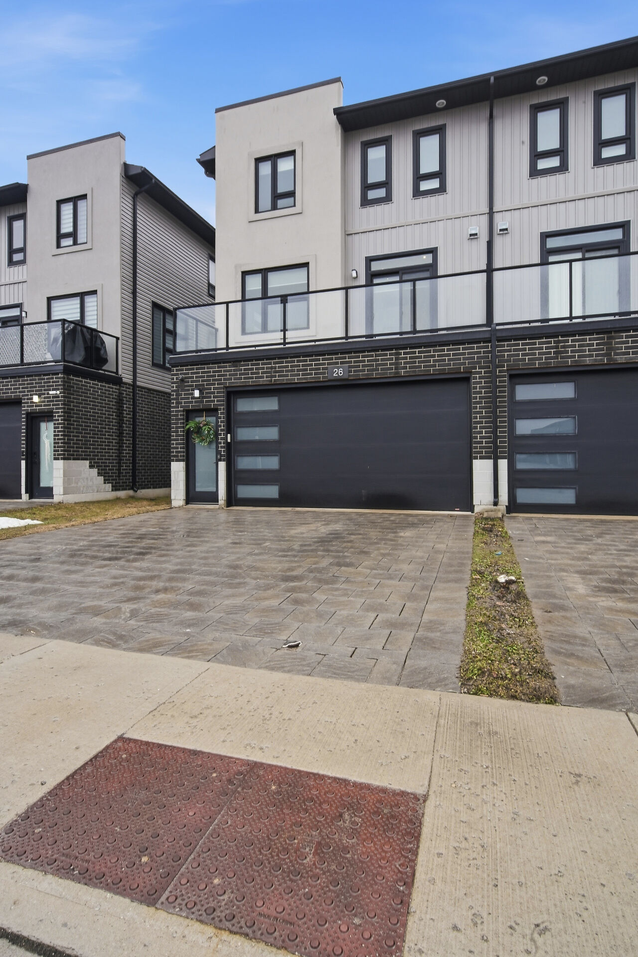 Stylish end unit three-storey vacant land condo backing onto peaceful parkland in desirable Andover Trails. Offering approximately 1,983 sq ft with a rare double car garage, this home provides exceptional space & flexibility. The main level features a bedroom/office & full bath. The bright second level showcases all luxury vinyl plank floors, gas fireplace, patio doors to balcony & a modern kitchen with quartz counters, large island, walk-in pantry, & dining area with 2nd balcony patio. The upper level offers three spacious bedrooms including a primary suite with glass walk-in tiled shower. Ideally located close to parks, shopping, schools, transit, and easy highway access.